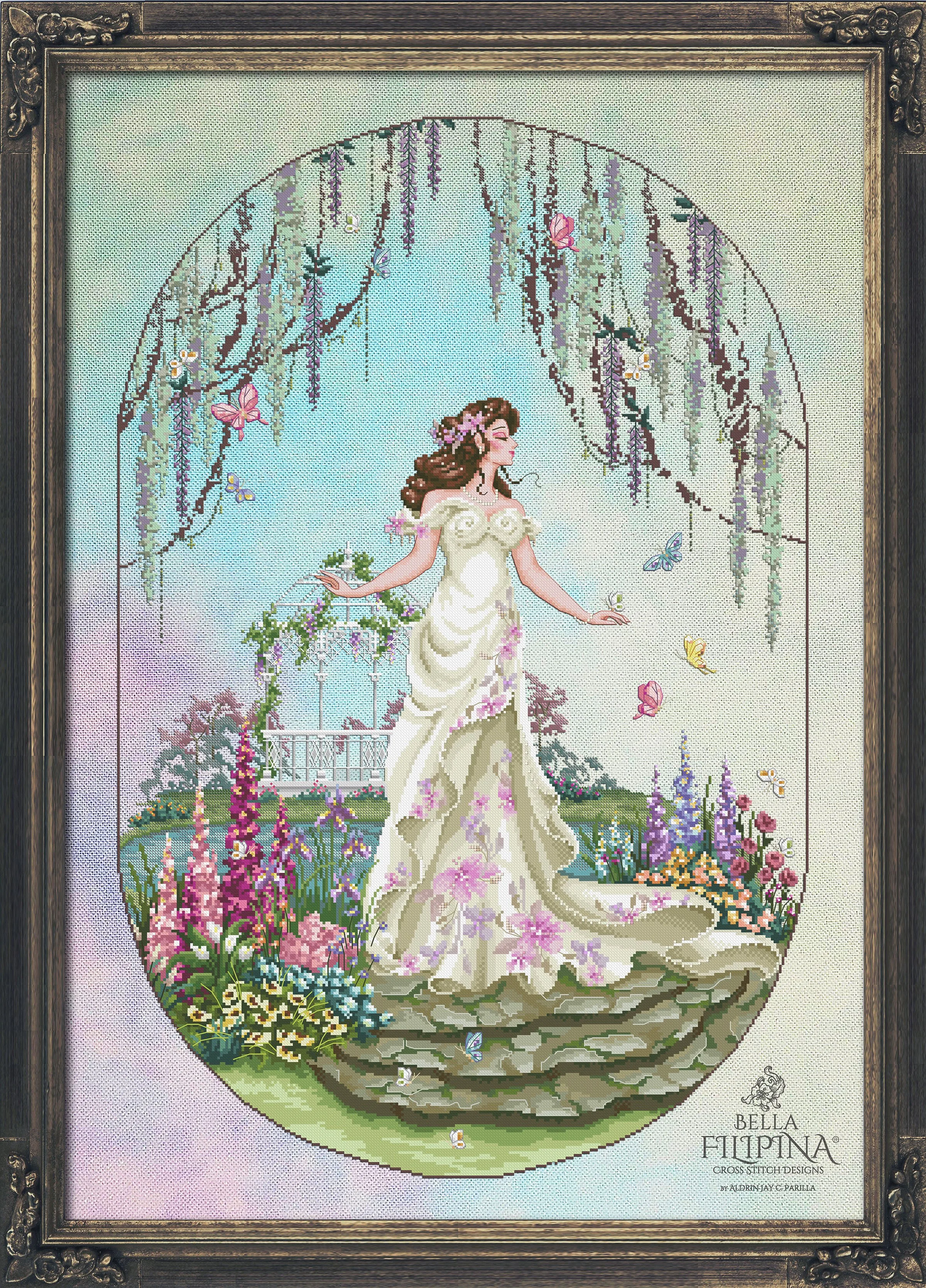 "The air smells of honey and freshly picked flowers. Antheia, named after a goddess of gardens, enjoys her morning strolls through their well-kept, cottage garden-inspired orchard. There are monkshoods, hollyhocks, and hydrangeas. Even peonies, geraniums, and lilies. Let's not forget her favorite, irises! In celebration of our tenth anniversary, this design reflects the vivid and vibrant beauty of spring. With Bella Filipina Cross Stitch Designs, every stitch is like painting with threads, creating a delicate and serene masterpiece.”