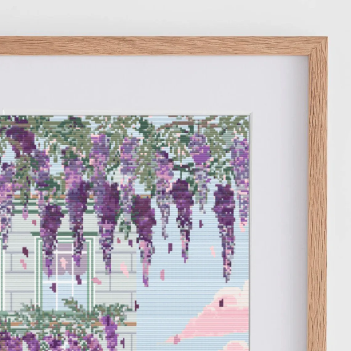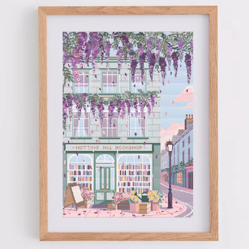 Beautiful English façade cross-stitch pattern, with a pretty English bookstore in Notting Hill, surrounded by wisteria trees.