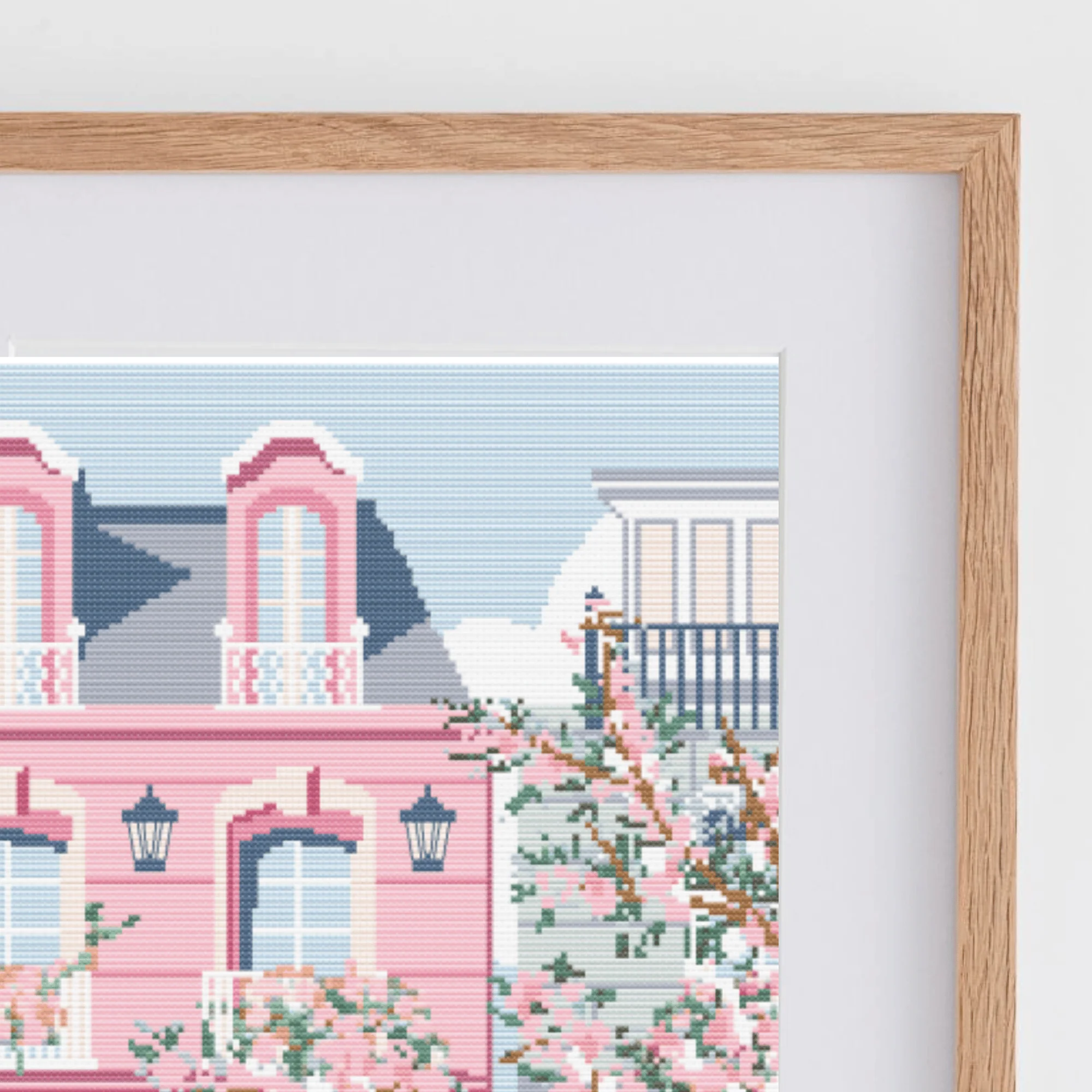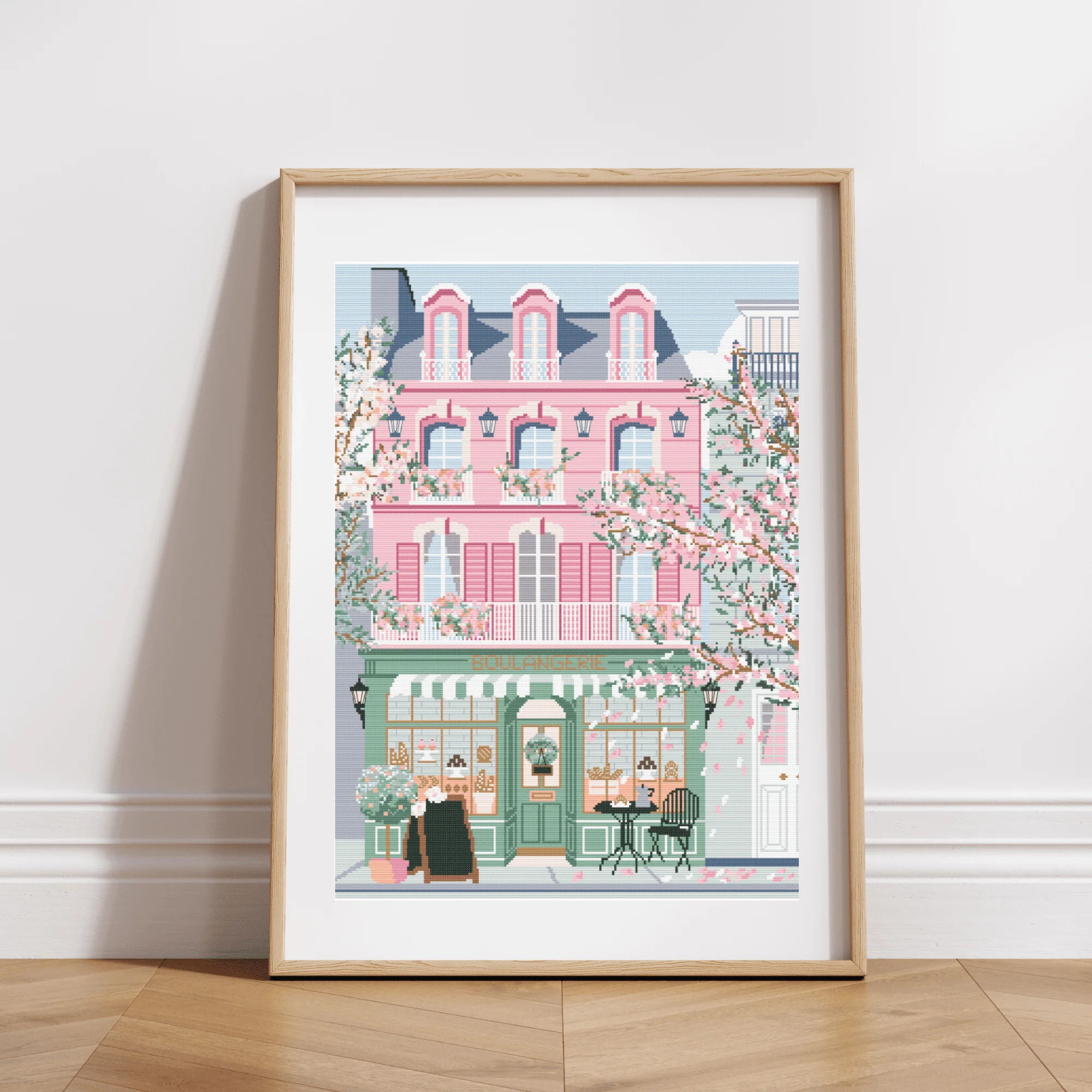 French façade cross-stitch pattern, with a pretty parisian building surrounded by cherry trees. 31 colors Color guide in DMC colors