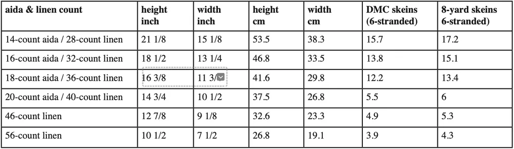 16 count:13.2" × 18.4"/ 33 × 47 cm