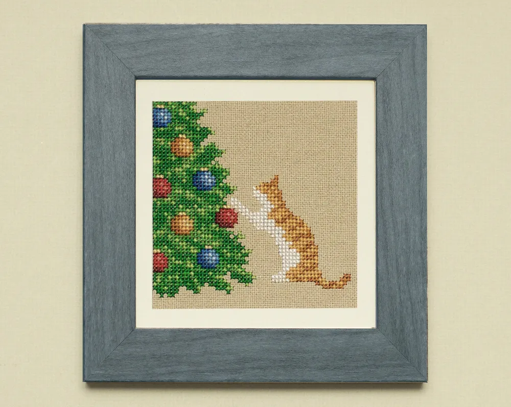 Ah, cats and Christmas trees. This sweet cross stitch of an orange tabby captures that moment the cat first discovers those irresistible shiny baubles. It is easy to stitch and a fun project for both beginners and experienced cross stitchers.