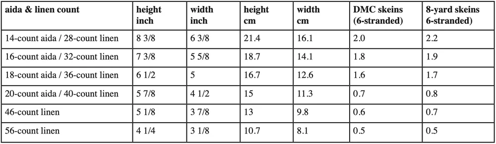 16 count:5.6" × 7.4"/ 14 × 19 cm