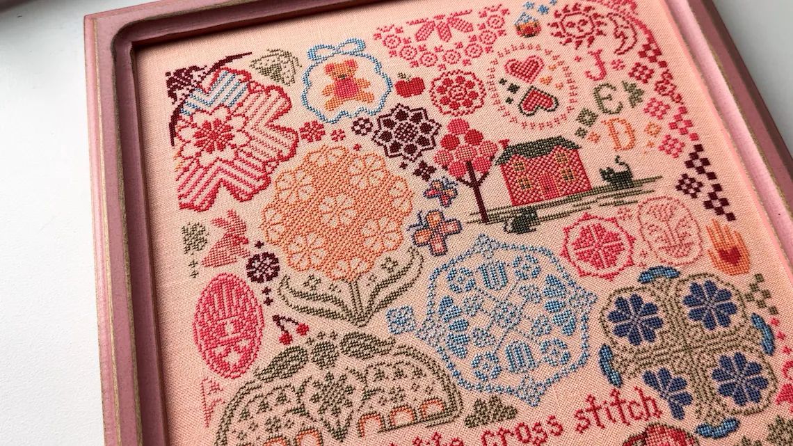 The model is stitched on 40 count "apricot" linen by Zweigart using 1 strand of floss over 2 linen threads. The model was stitched using DMC cotton floss and 1 Threadworx cotton floss. A DMC conversion is provided in parenthesis below.