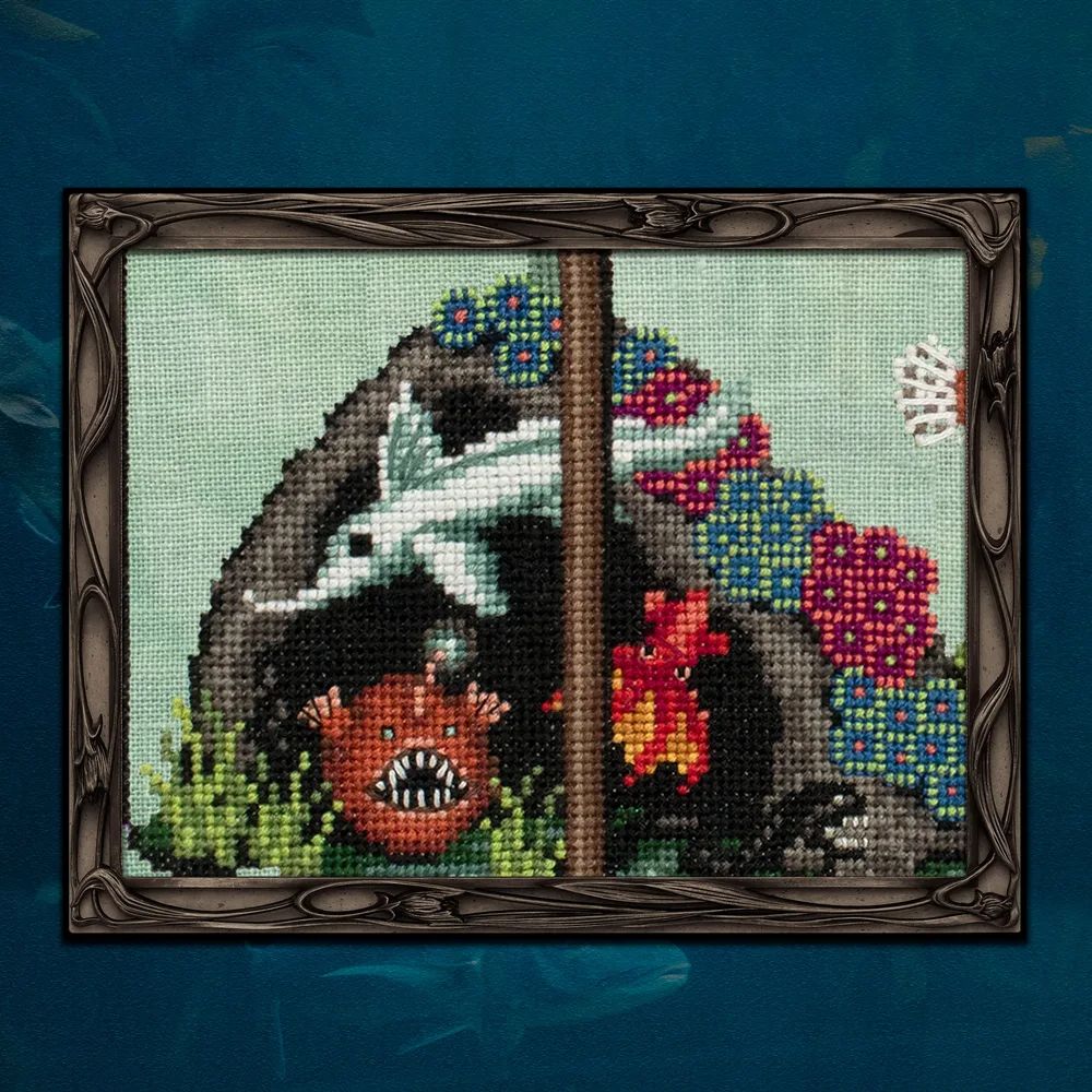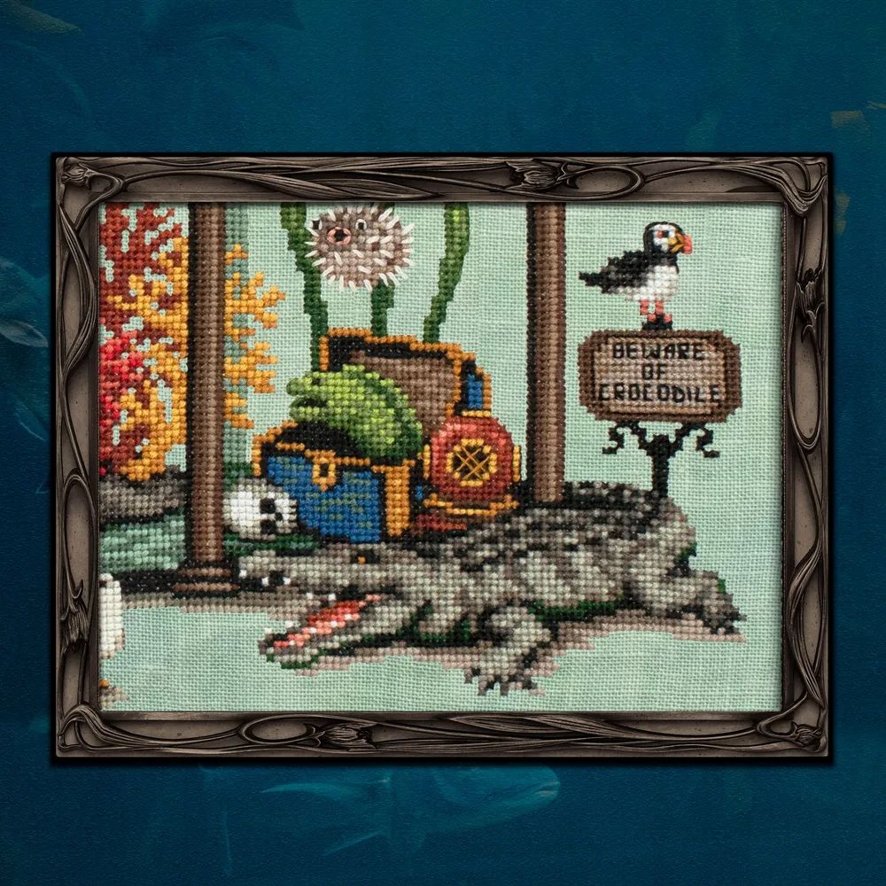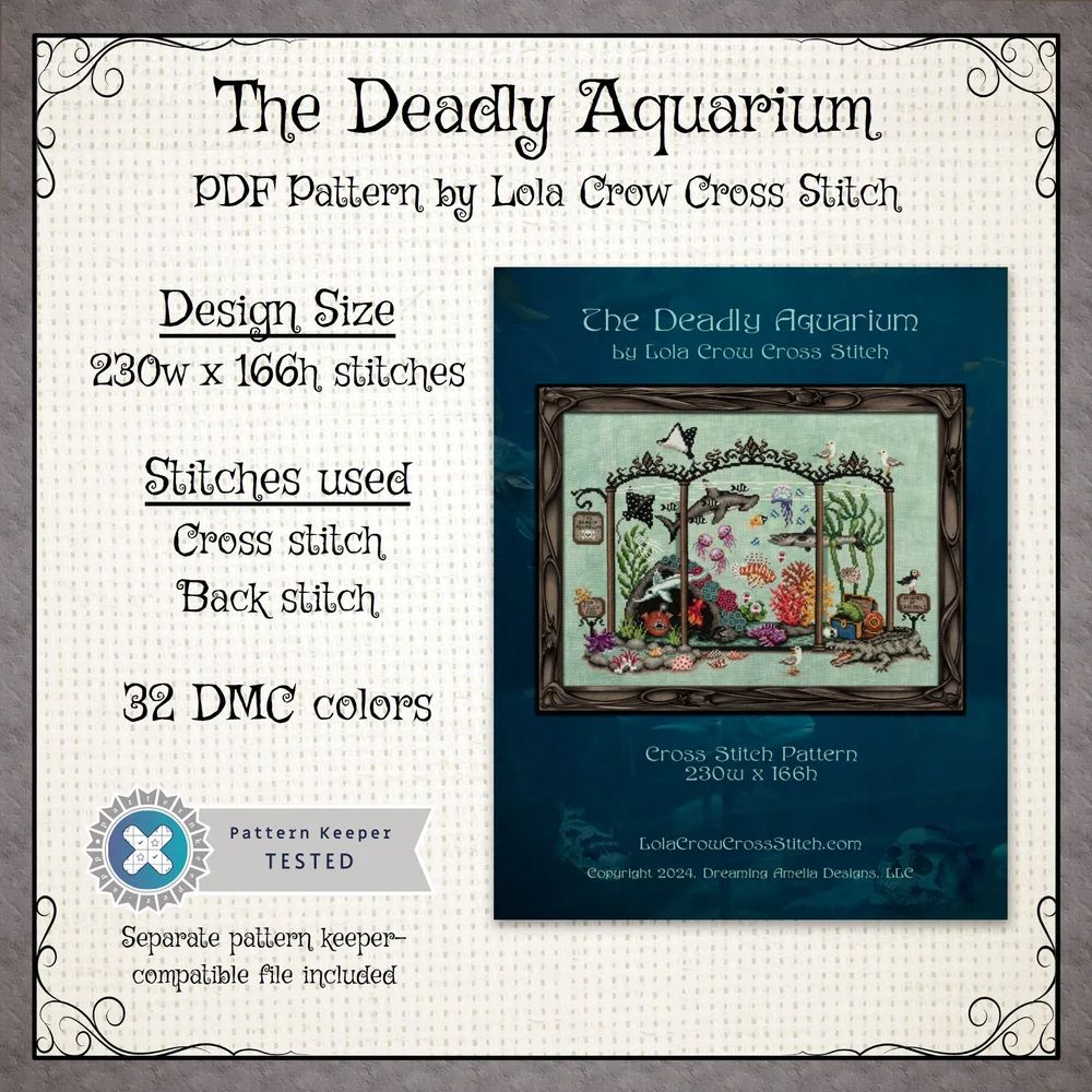 The design features an aquarium filled with the world's most dangerous and strange sea creatures. All of the animals in the aquarium represent real species. Also included is an index with facts about the featured creatures and a separate pattern file divided into the original sections (Exhibits) in case you want to stitch in the original SAL order. Sample was stitched on 36 count "Beanstalk" fabric by Fiber on a Whim. Suggested fabrics: “Beanstalk” linen or Aida by Fiber on a Whim "Sea Foam" linen by Weeks Dye Works “Aqua Blue” Aida by Zweigart “Minty Green” Aida by Wichelt The piece will look best stitched on a light/medium blue, green, gray, or aqua fabric.